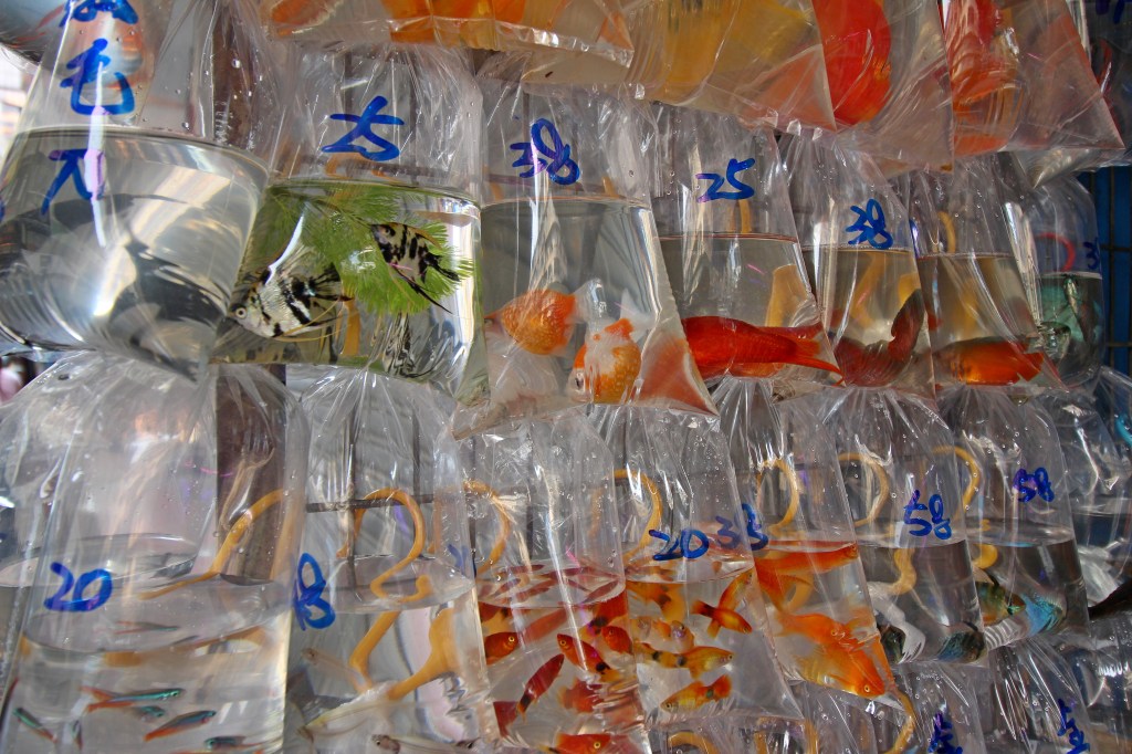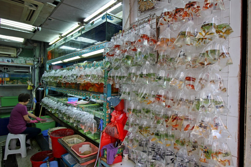 We heard and read about the goldfish market but it’s still a weird sight to see thousands of bagged fish of all shapes and colors lining the walls along Tung Choi Street North. The various shops on either side are devoted to the raising of many types of fish, from bright neon tropical species to endless variants of goldfish. They’re mostly contained in small plastic bags, ready to be taken home. The reasons for this is that it is believed to bring good luck and a ‘feng shui’ harmony to the house, and the lack of space for cats or dogs increases the demand for keeping tropical fish as pets.