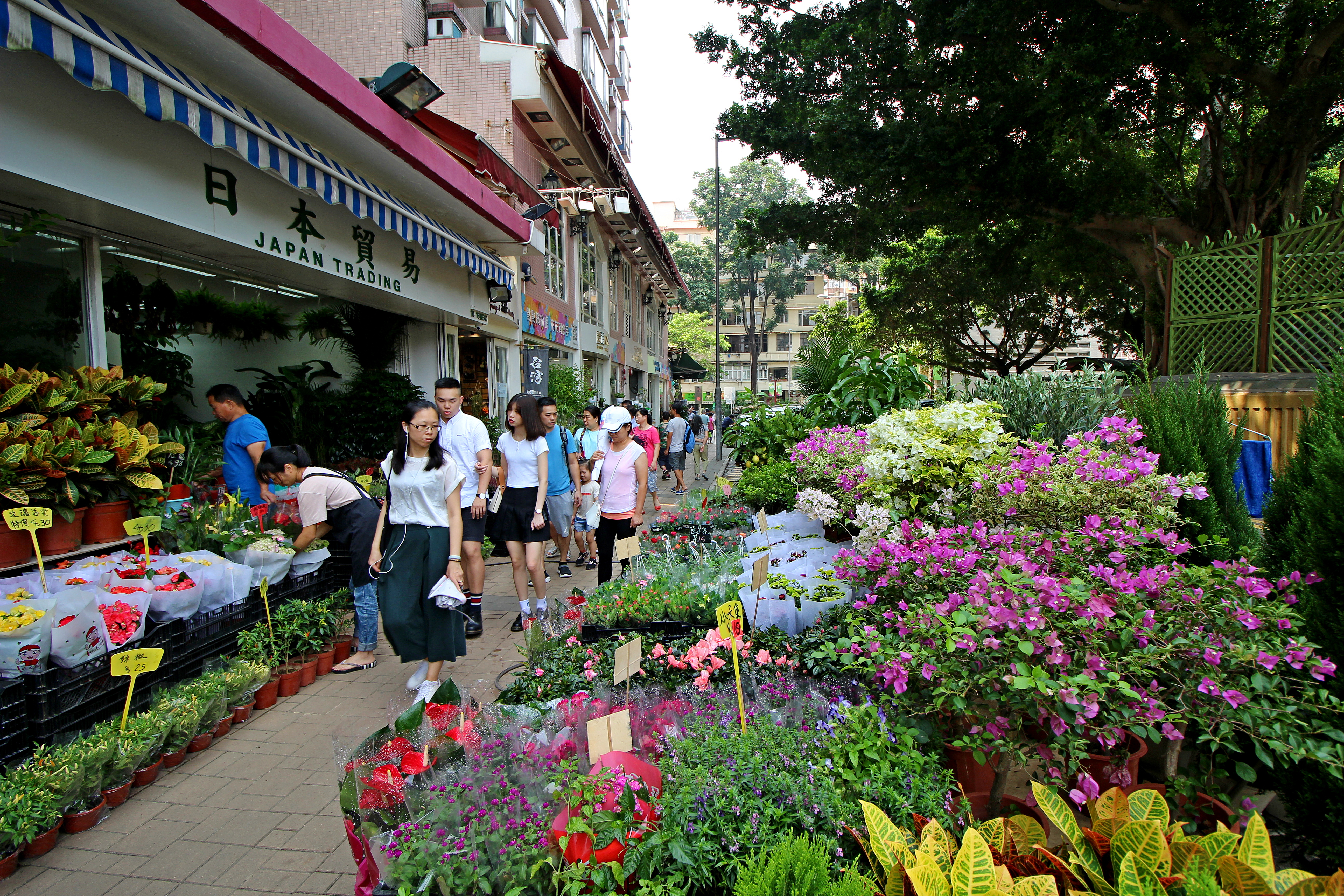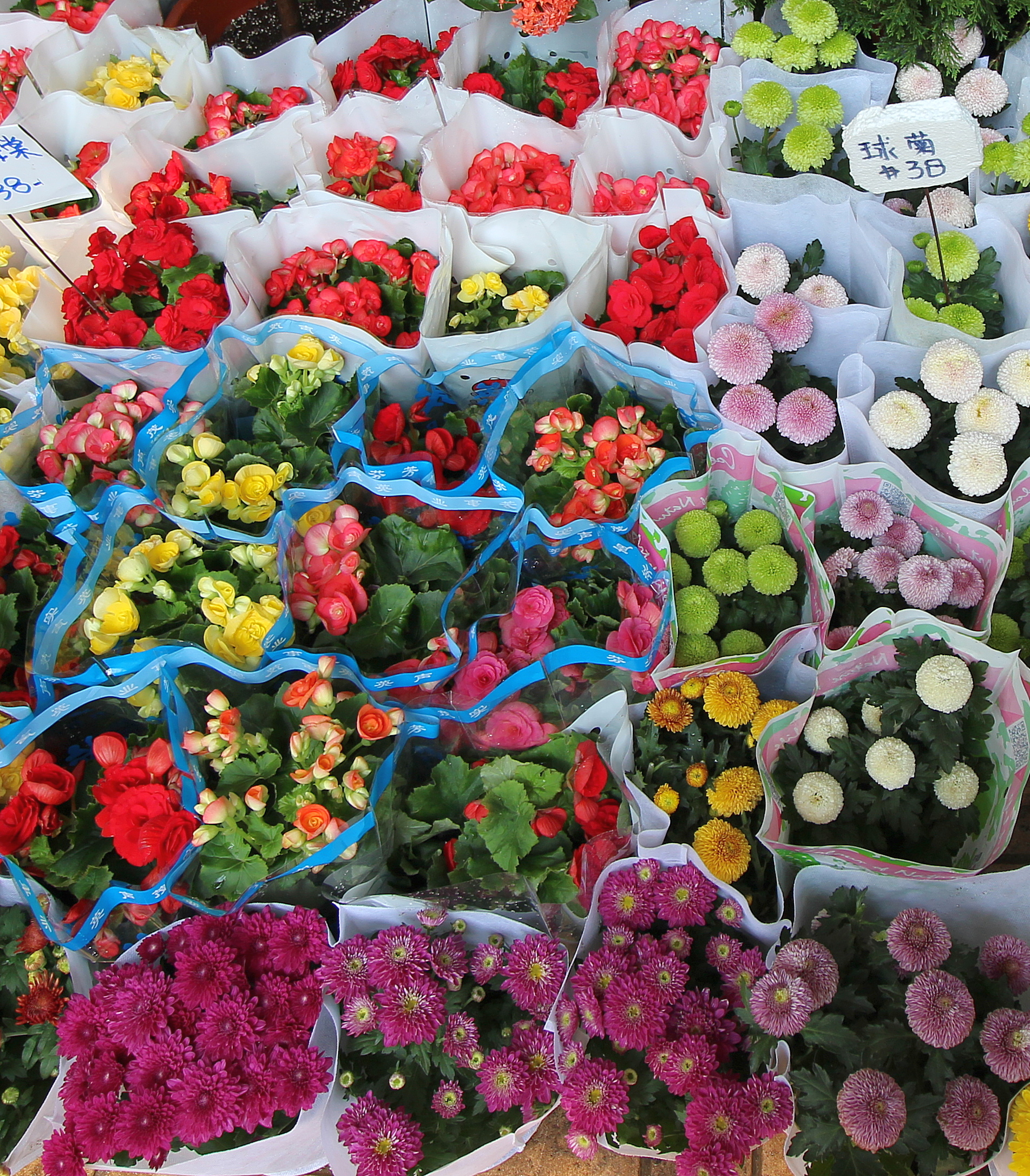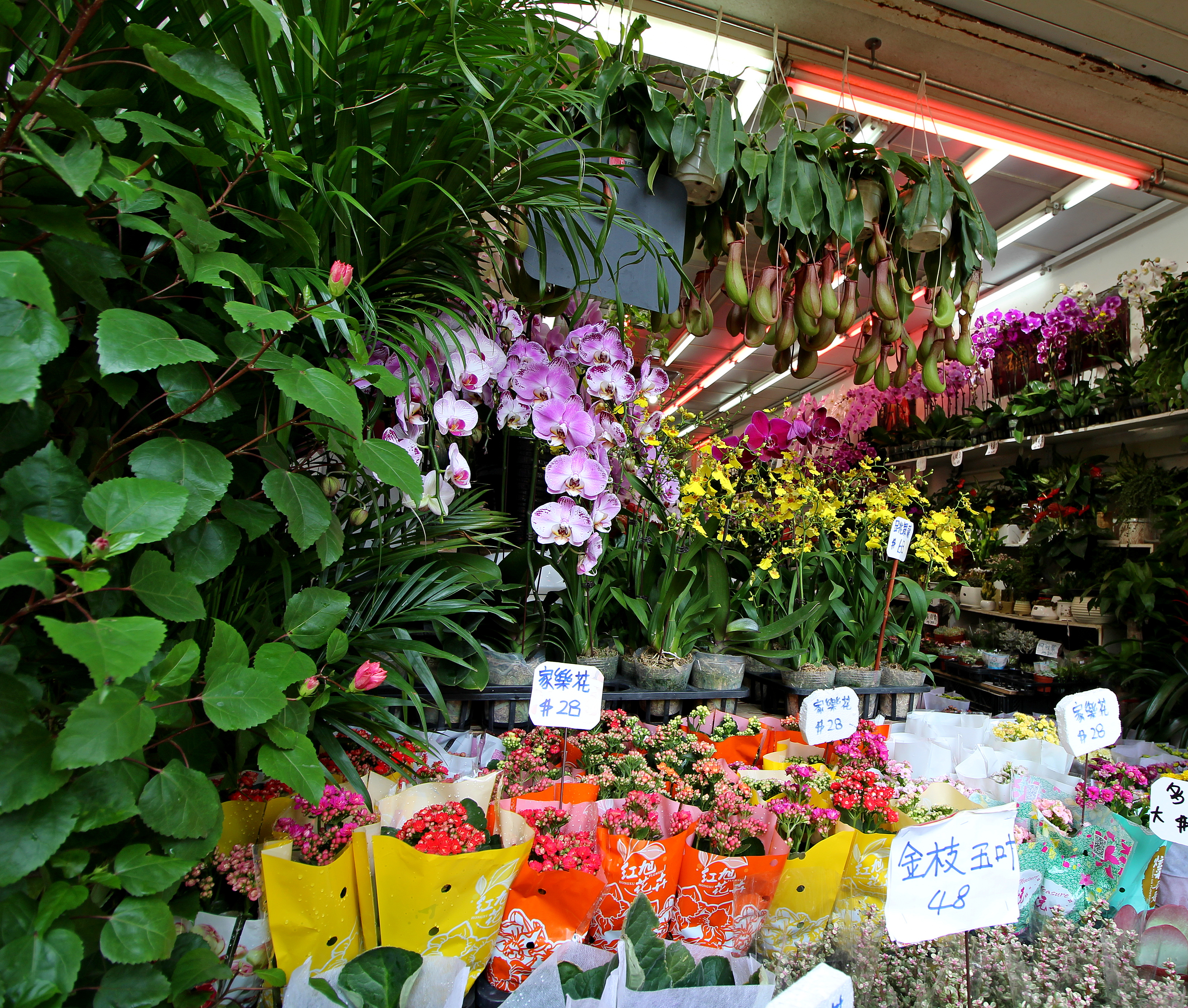 Walking through Hong Kong Flower Market is a real treat – an oasis of exotic plants, fresh cut flowers and uncountable fragrances. The variation in orchids seems endless and you can observe a colorful abundance of bustling vendors selling their cut blooms, potted plants, bonsai trees and garden accessories. Everywhere vendors are watering their plants which, with the air conditioners in the little shops offer visitors some respite from the humid, hot weather.