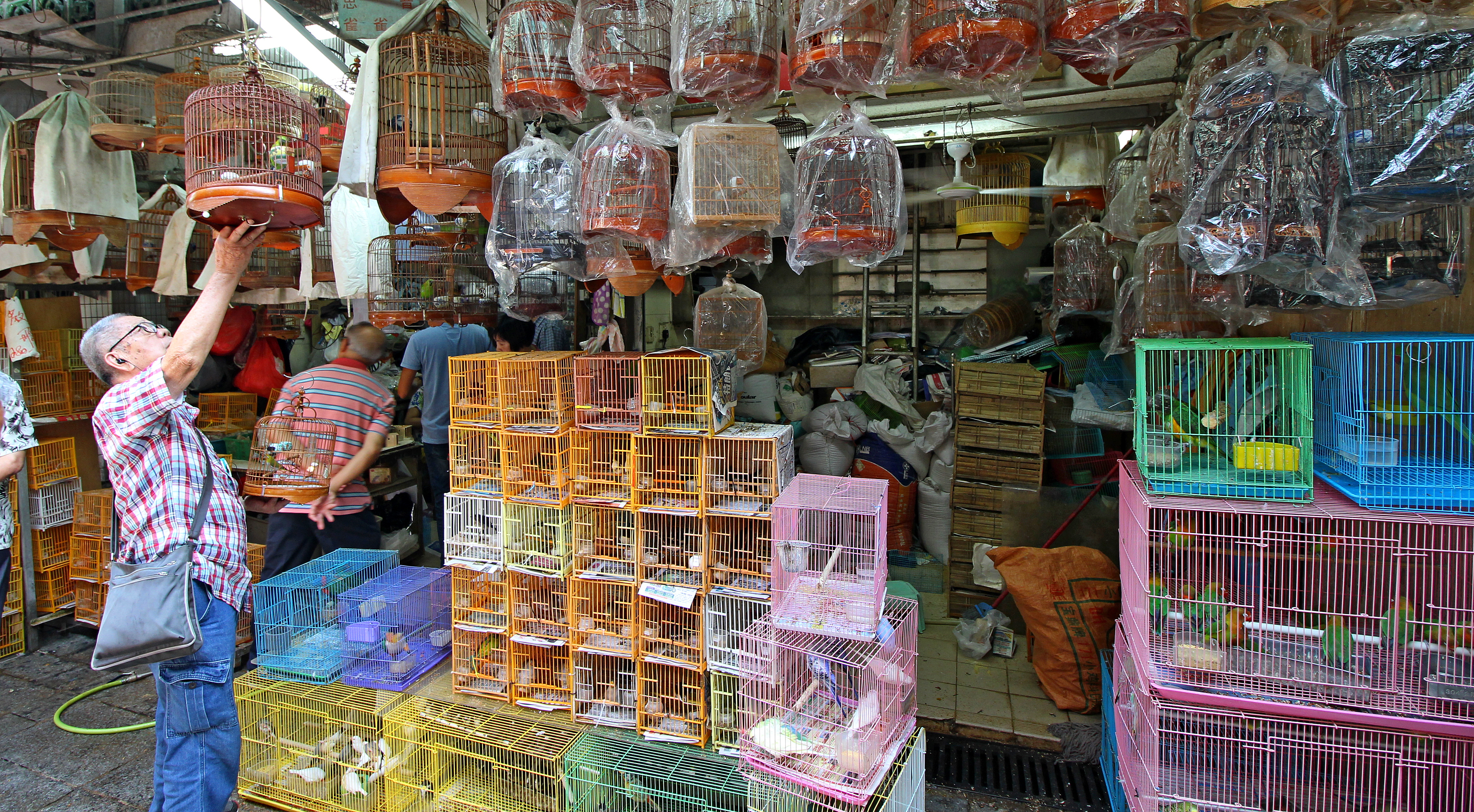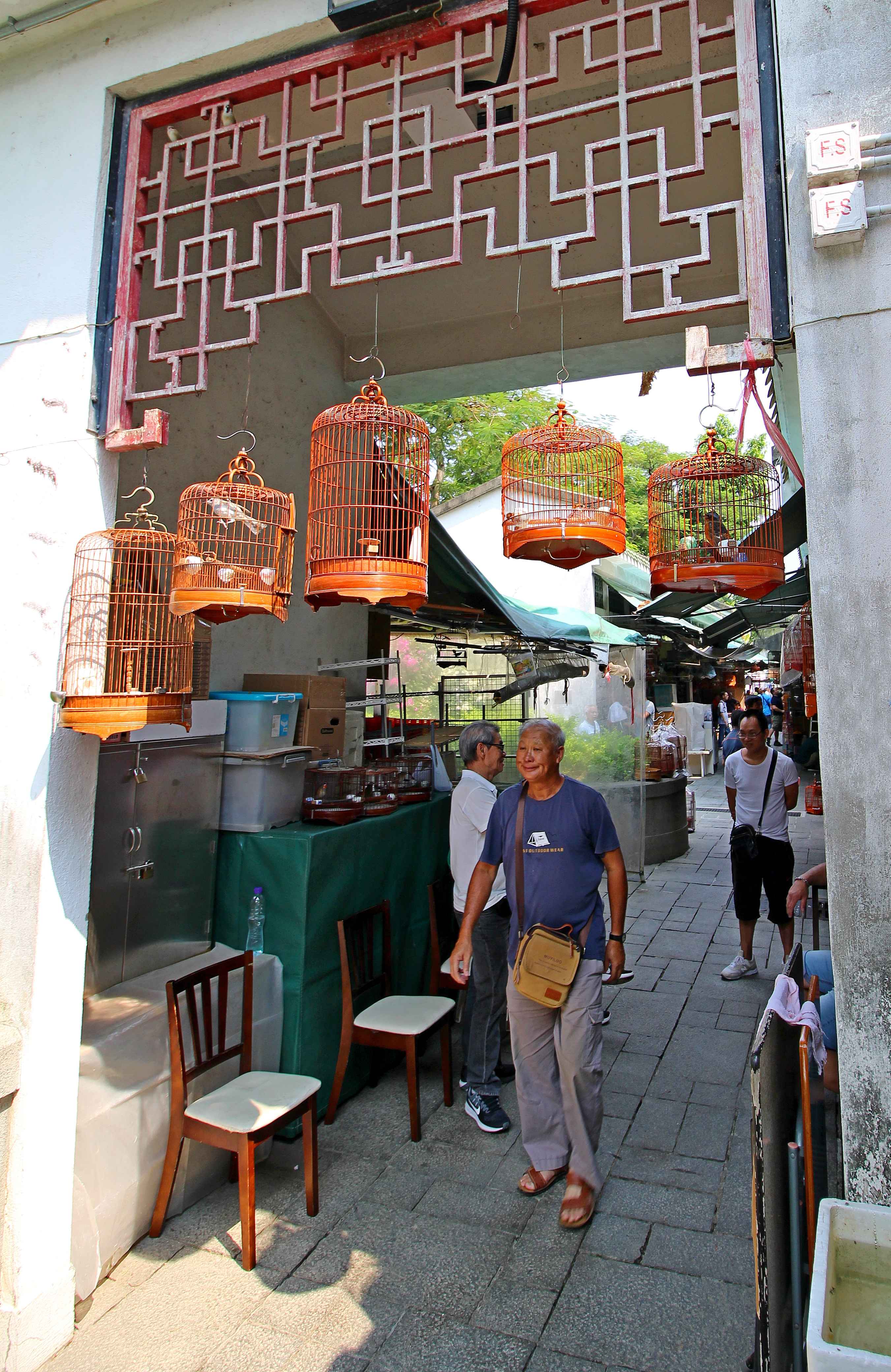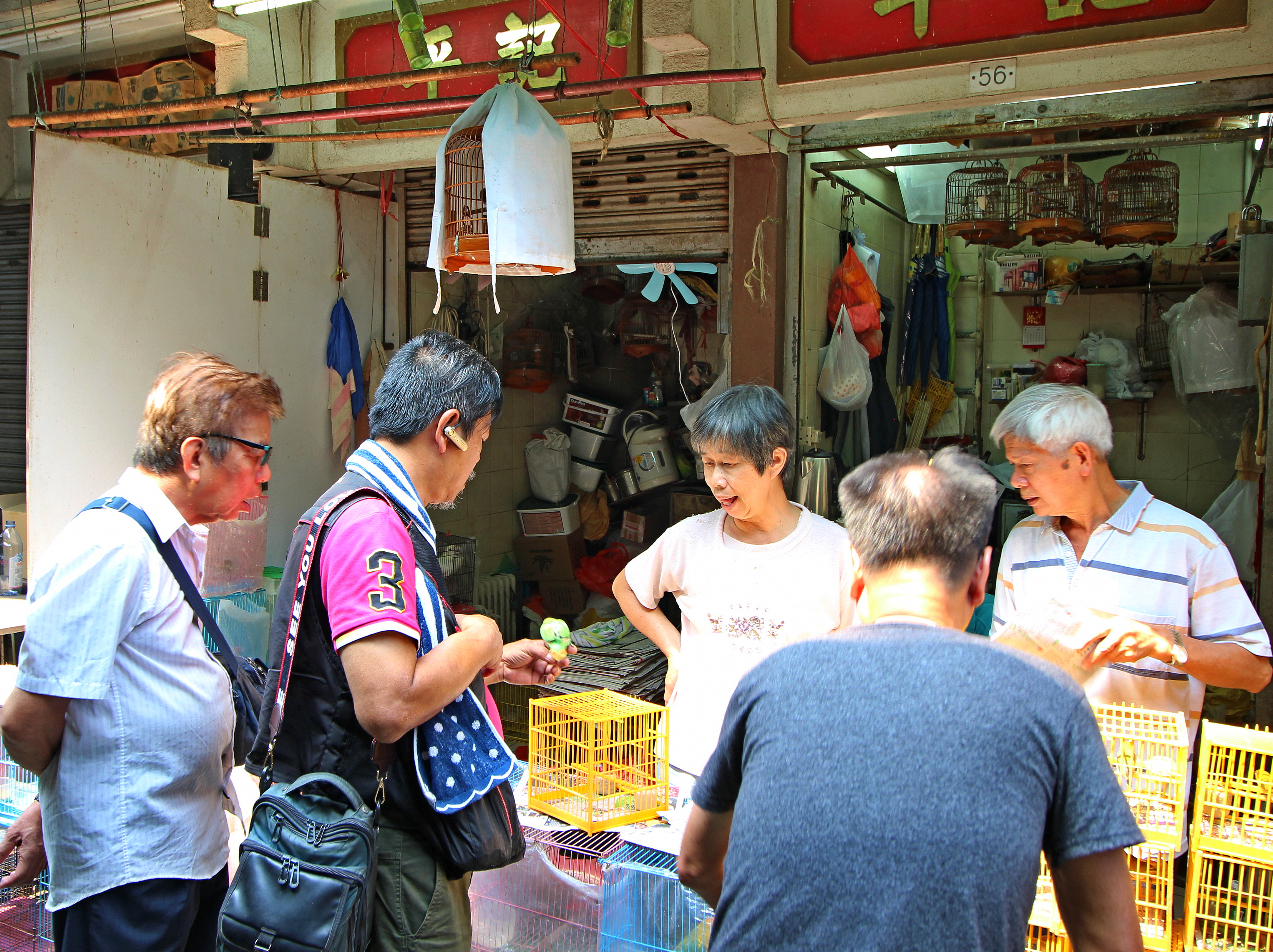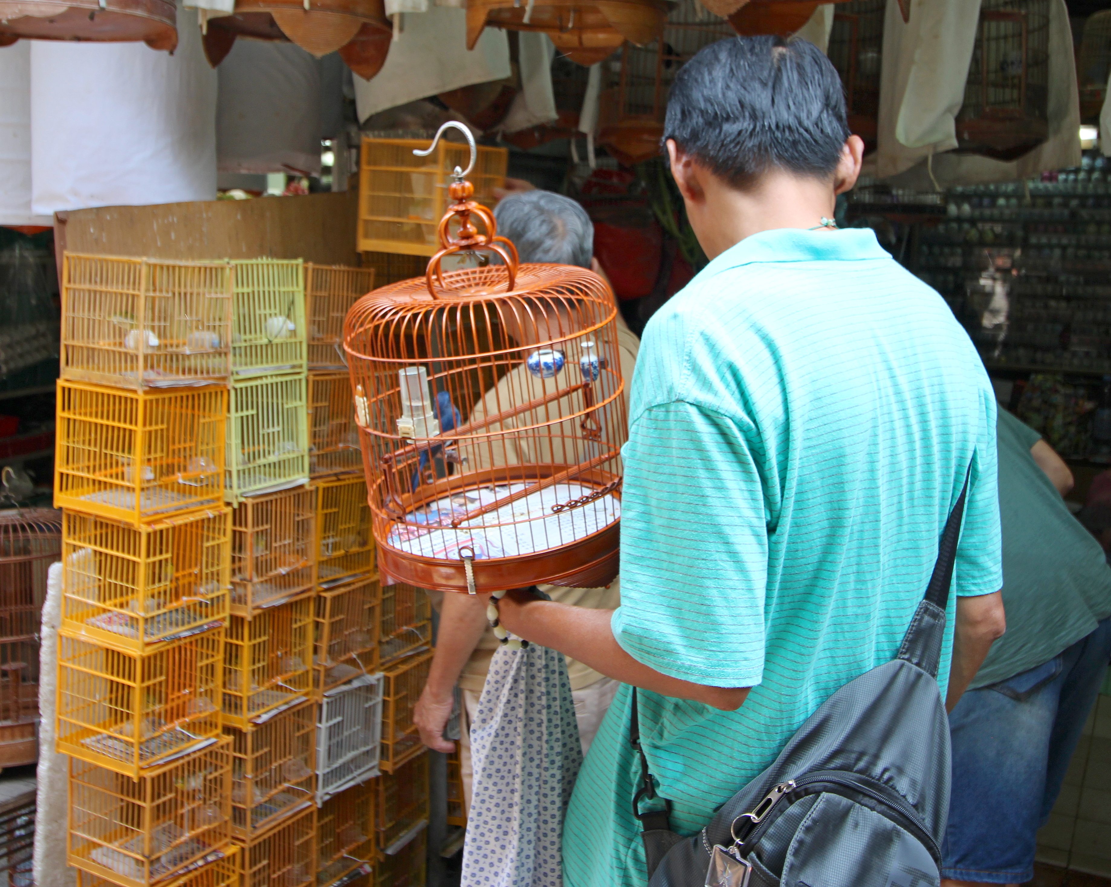 Next we visited the very interesting bird market on Yuen Po Street where mostly older men comes to show off their birds and their singing skills. They walk with their bird cages just as you would walk a dog and then hang the cages from the trees, and while the birds ‘socialize’ they meet to partake in a game of cards or simply sit around and chat. There are beautiful bamboo cages on sale too, and lots of small plastic cages stacked with birds from various species. I could not help feeling sad for them being so confined, but they did appear to be well cared for and healthy.