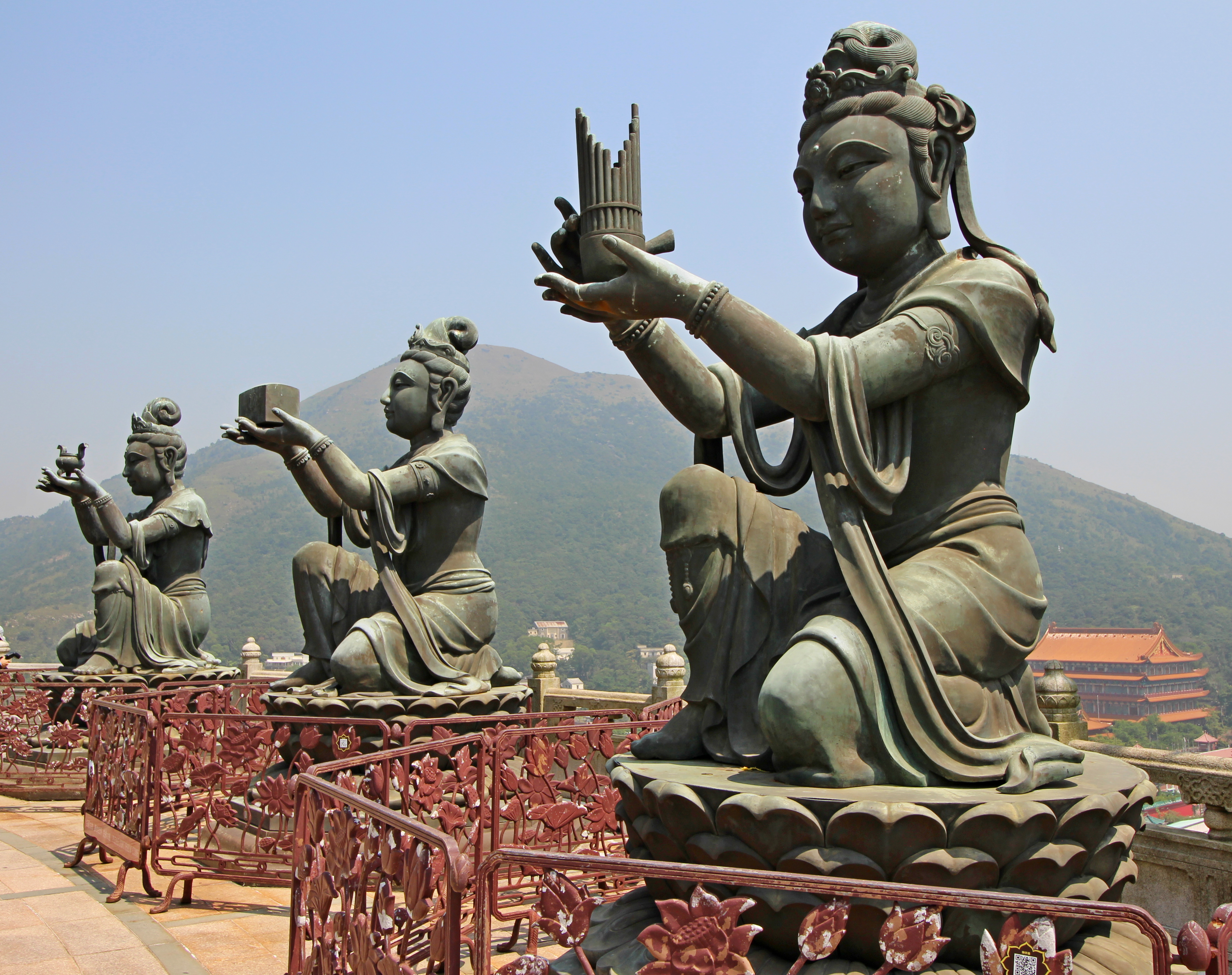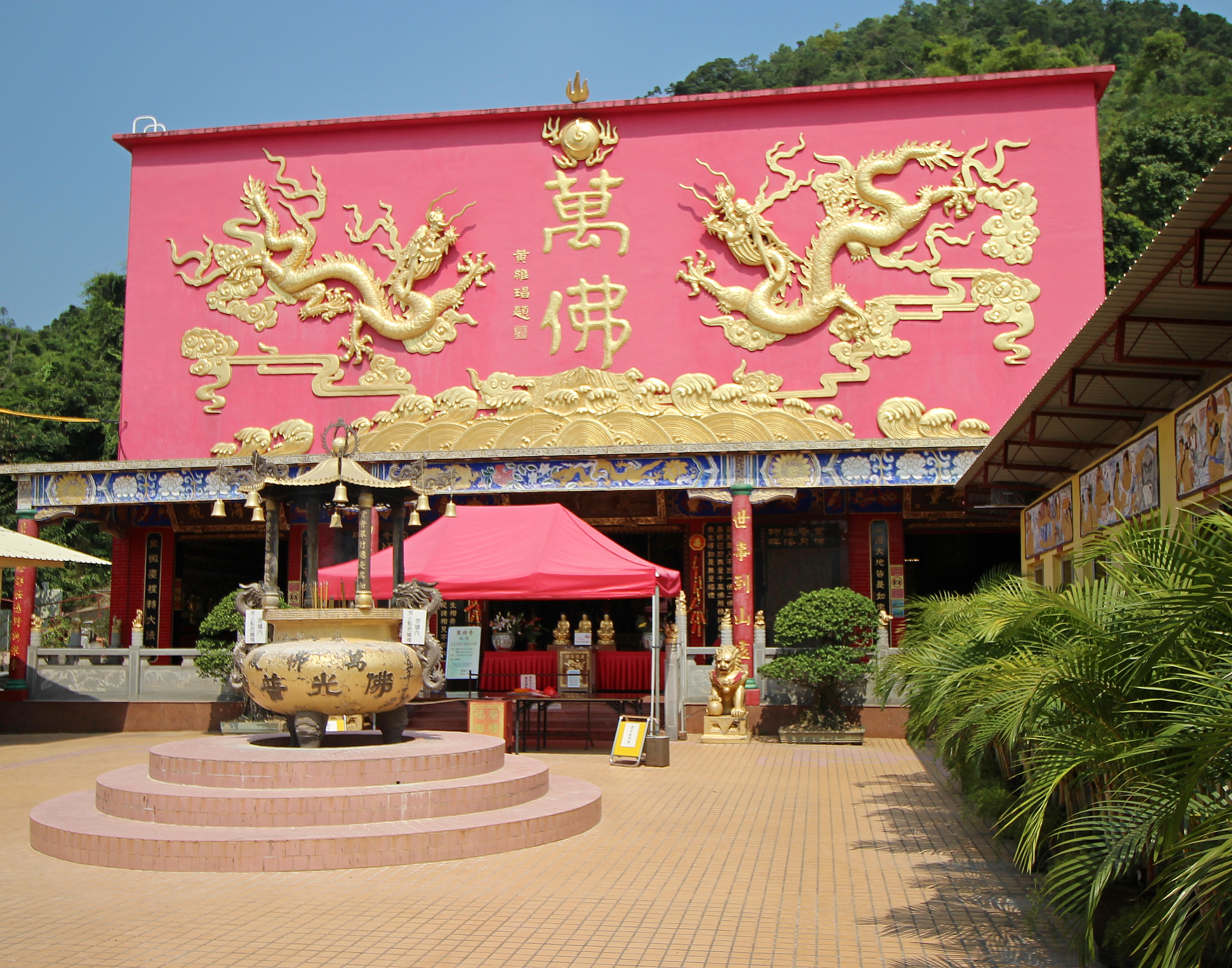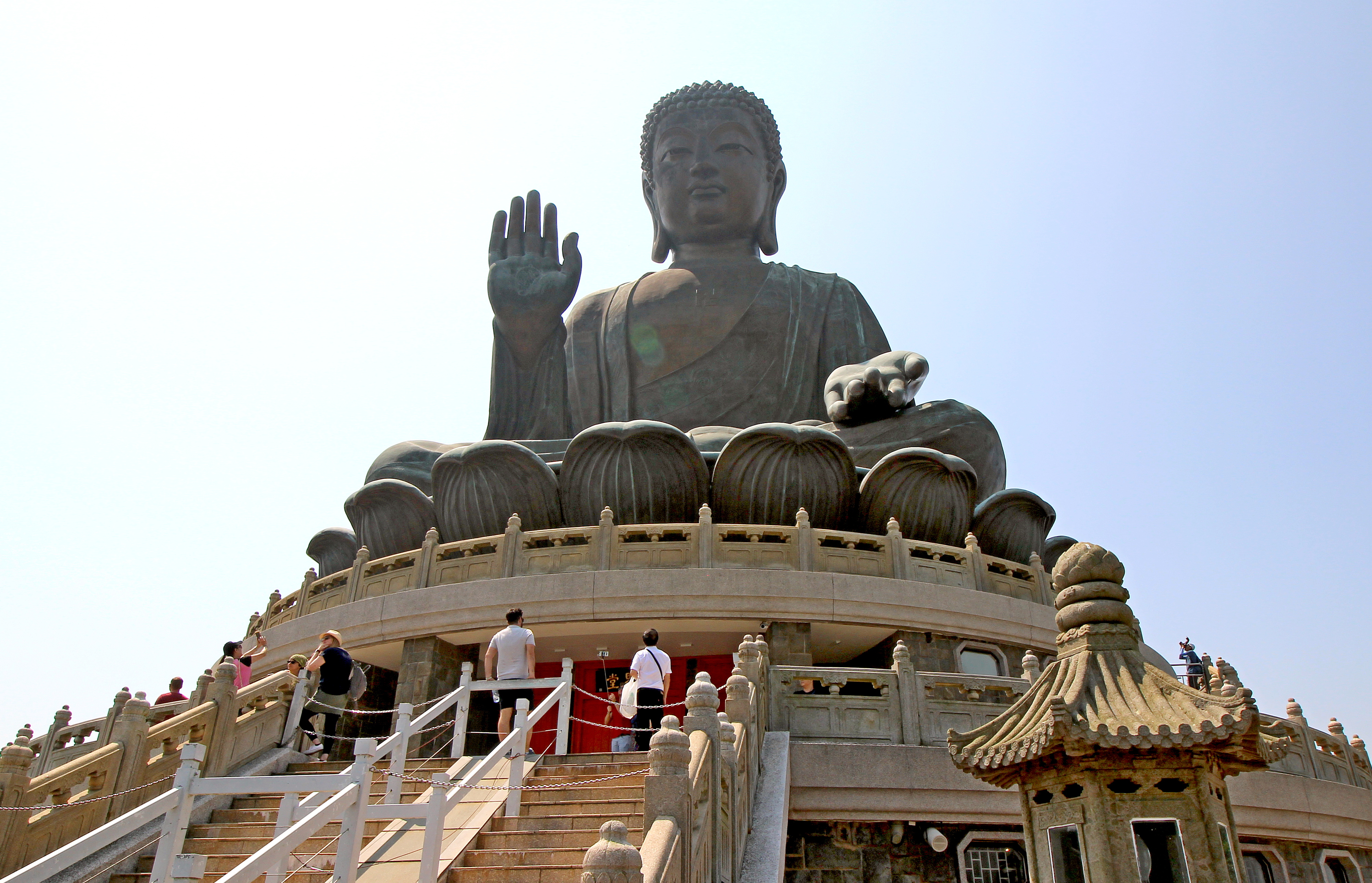 The elevated outdoor bronze Buddha sits formerly atop the peak of Mount Muk Yue. The size of it makes this an interesting sight. It was cast with 250 tonnes of bronze and built over 12 years. At the level just below the main statue, there are 6 smaller statues of Devas offering flowers, incense, a lamp, ointment, fruit, and music to the Buddha.