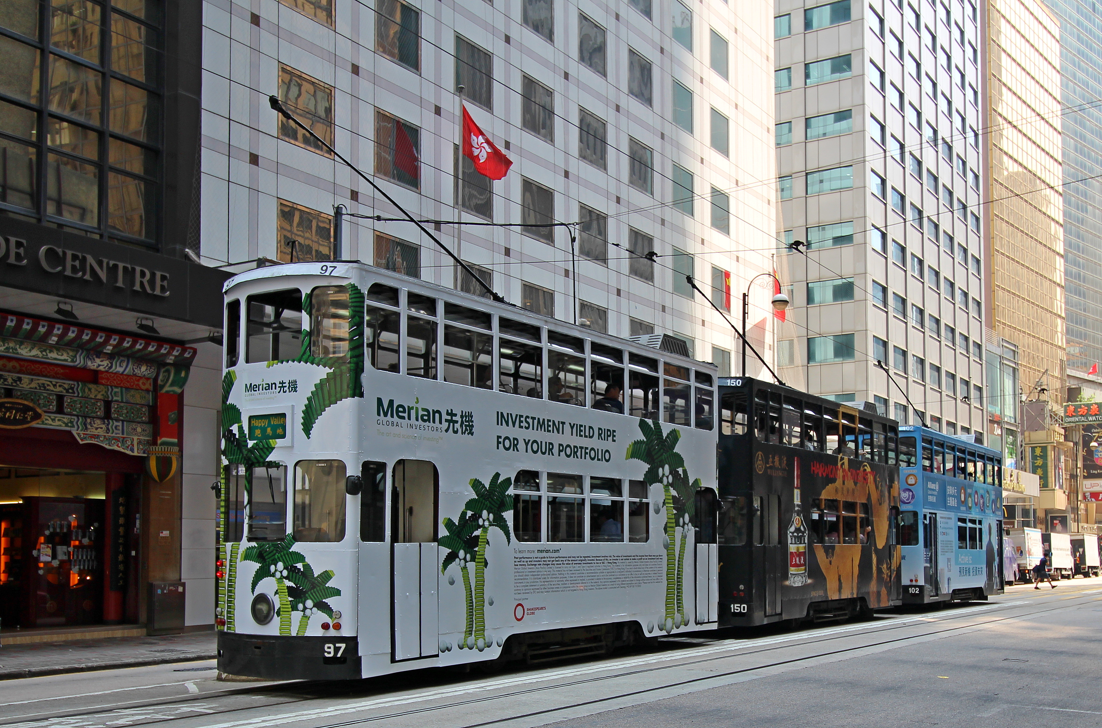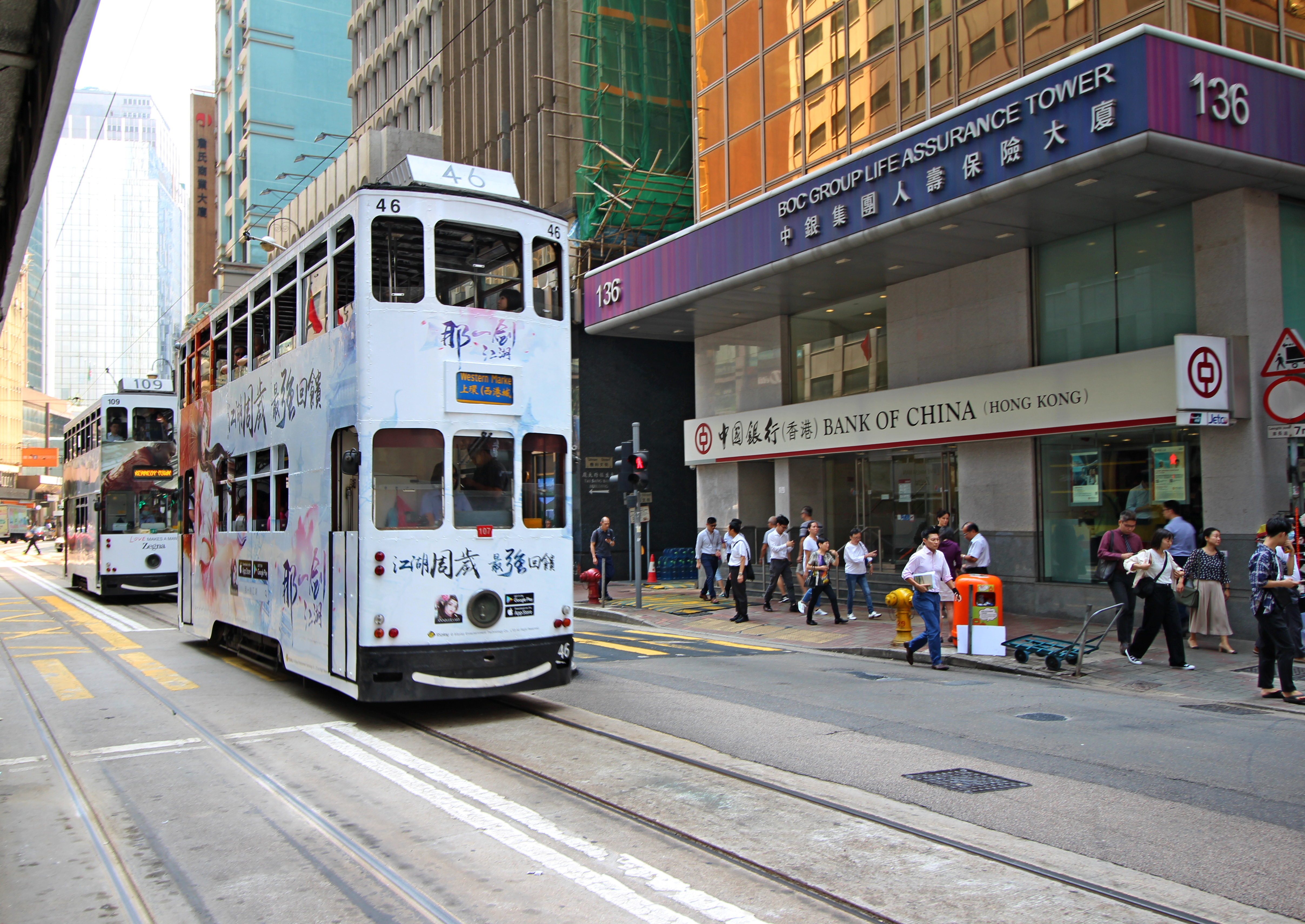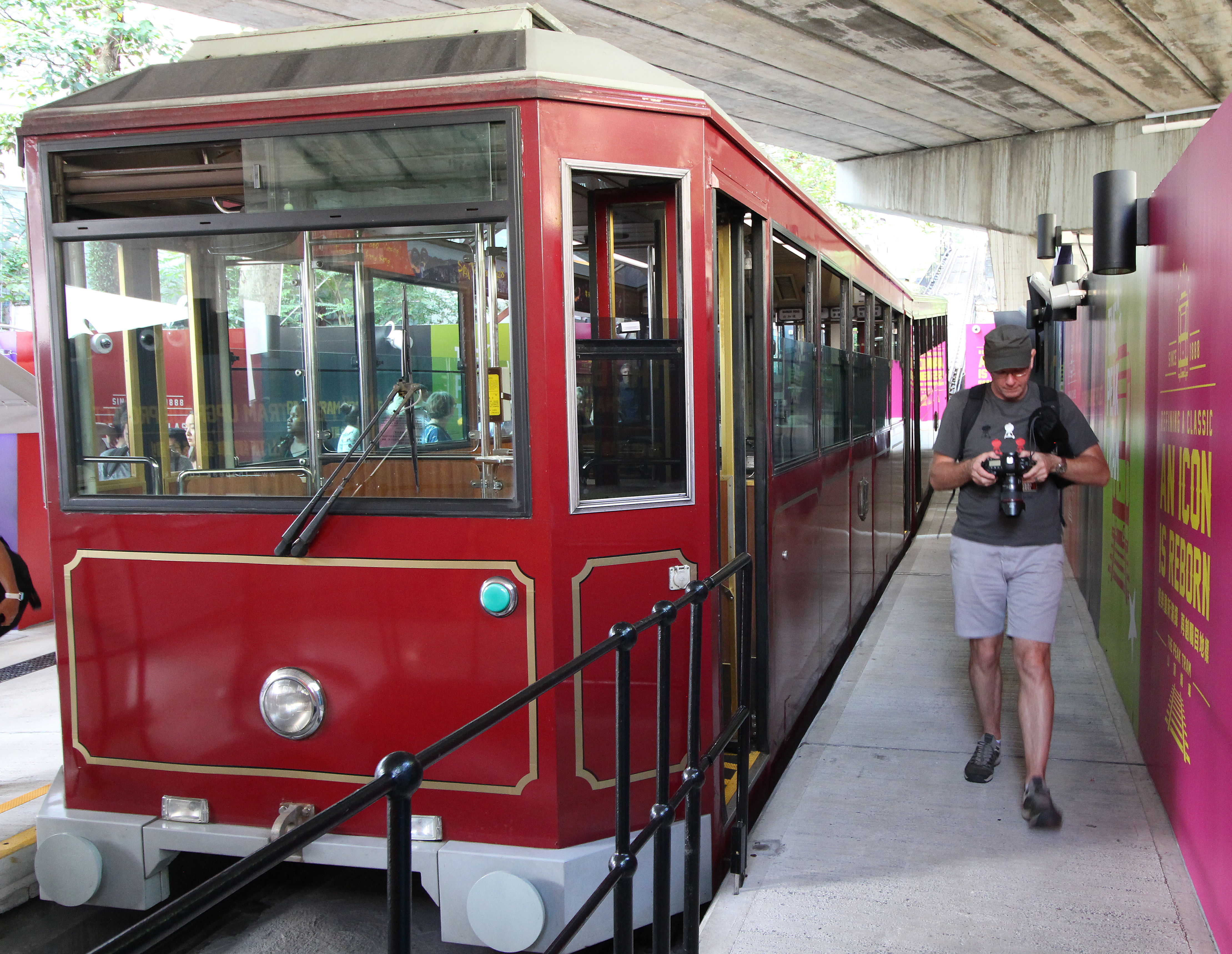 After great coffee with amazing views (Pacific Coffee) we took the Peak tram down to Hong Kong Island. This cable-hauled tram has been Hong Kong’s most reliable form of public transport between Central district and The Peak since 1888. The Peak Tram runs every 10 to 15 minutes from 7 am to midnight, and using an Octopus card to pay for the ticket will help reduce your queuing time. That applies to going up during the busy part of the day – since we were coming down at 09:00 already, we had the coach to ourselves!